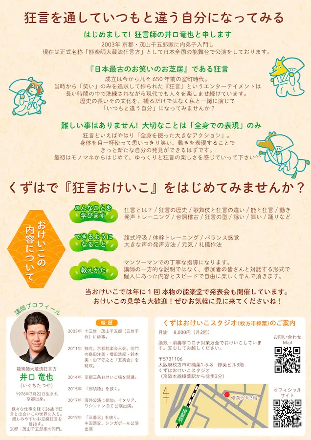 狂言おけいこ デザイン&イラスト制作 狂言おけいこ デザイン&イラスト制作 能楽師大蔵流狂言方 井口竜也さんのお稽古教室のイラスト制作とフライヤーデザインを担当いたしました。 イラストは狂言の「呼声」という演目の1シーンになります。 Client:井口竜也 Views: 169 category: お仕事 表紙イラスト 古いエントリーへ 新しいエントリーへ